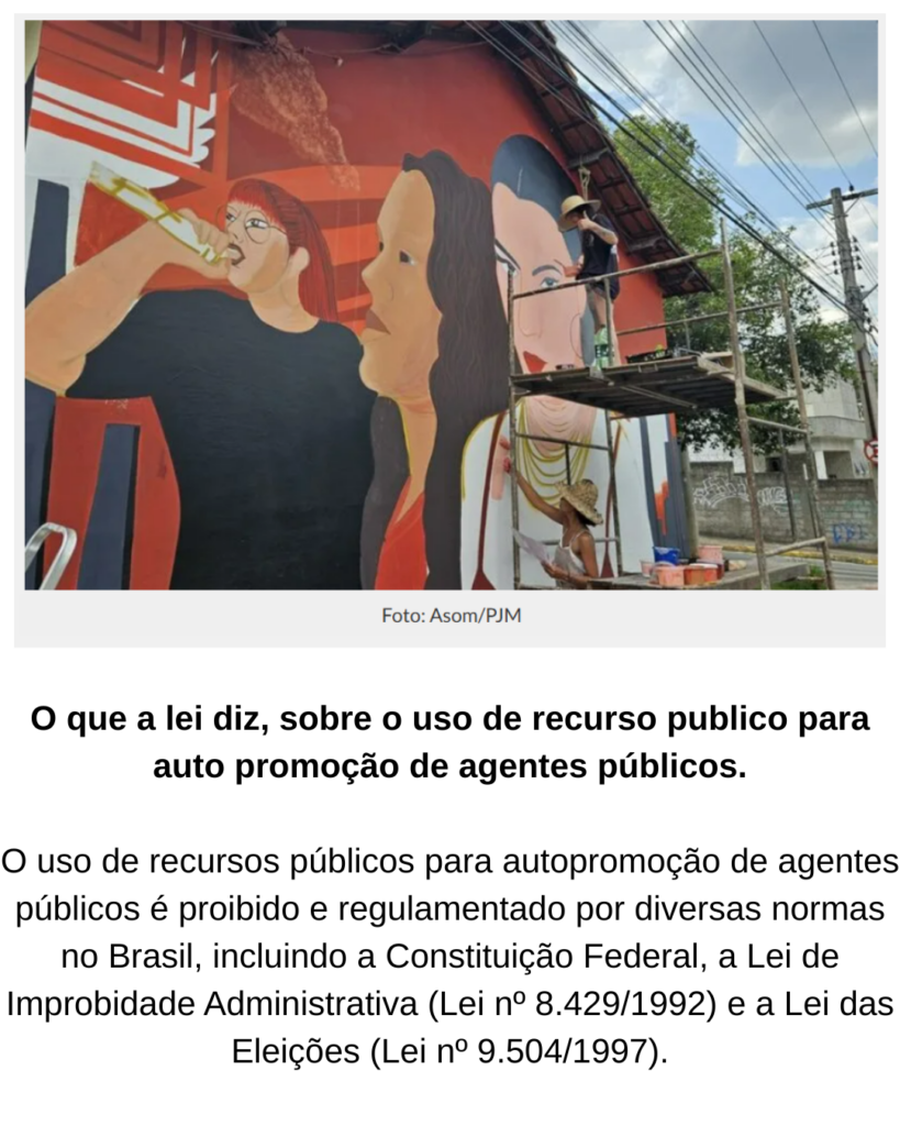 Ou seja, recursos públicos não podem ser usados para fins de promoção pessoal, mesmo que de forma indireta, como murais, placas, banners, redes sociais ou qualquer outro meio que destaque o nome, imagem ou feitos de agentes públicos de forma a enaltecê-los individualmente.